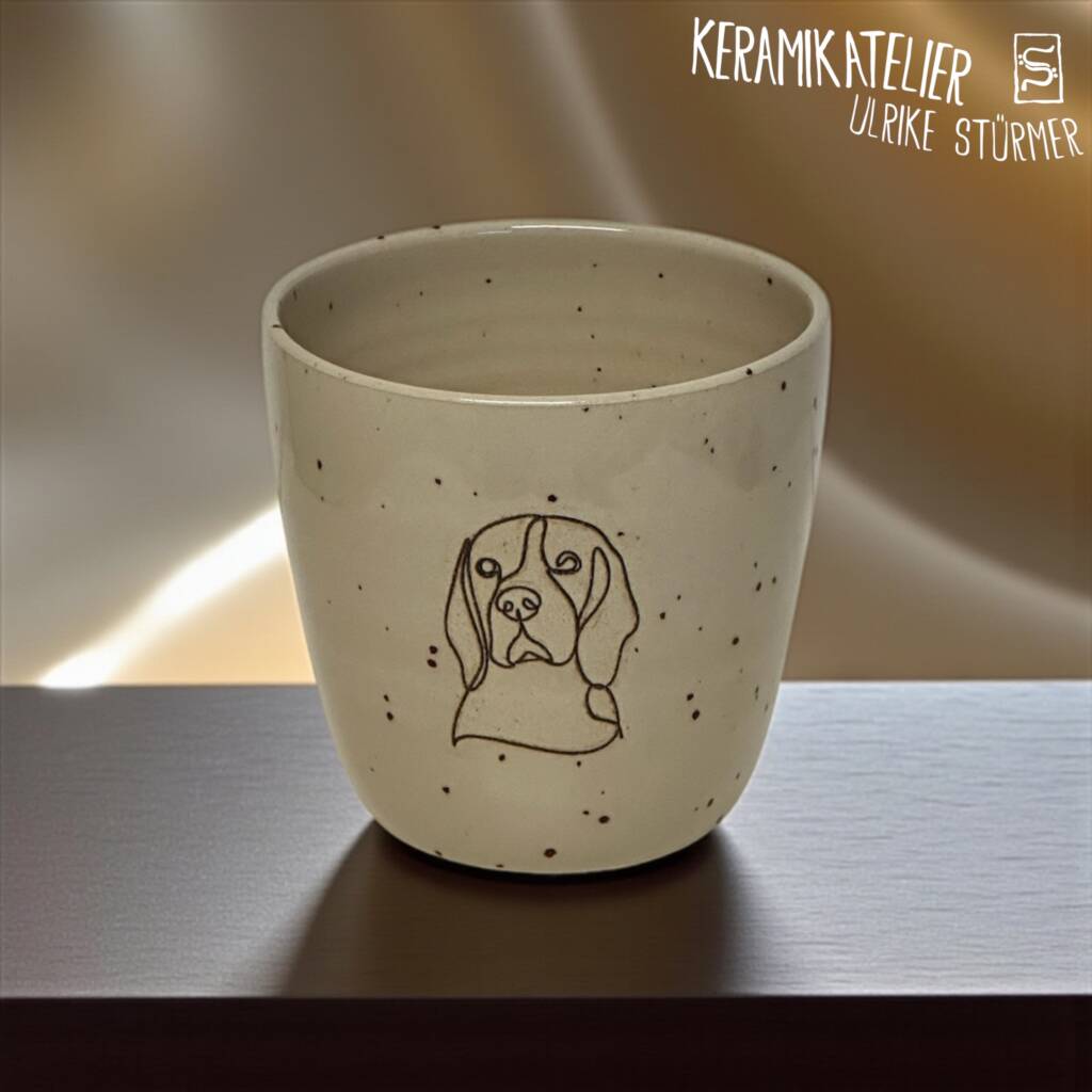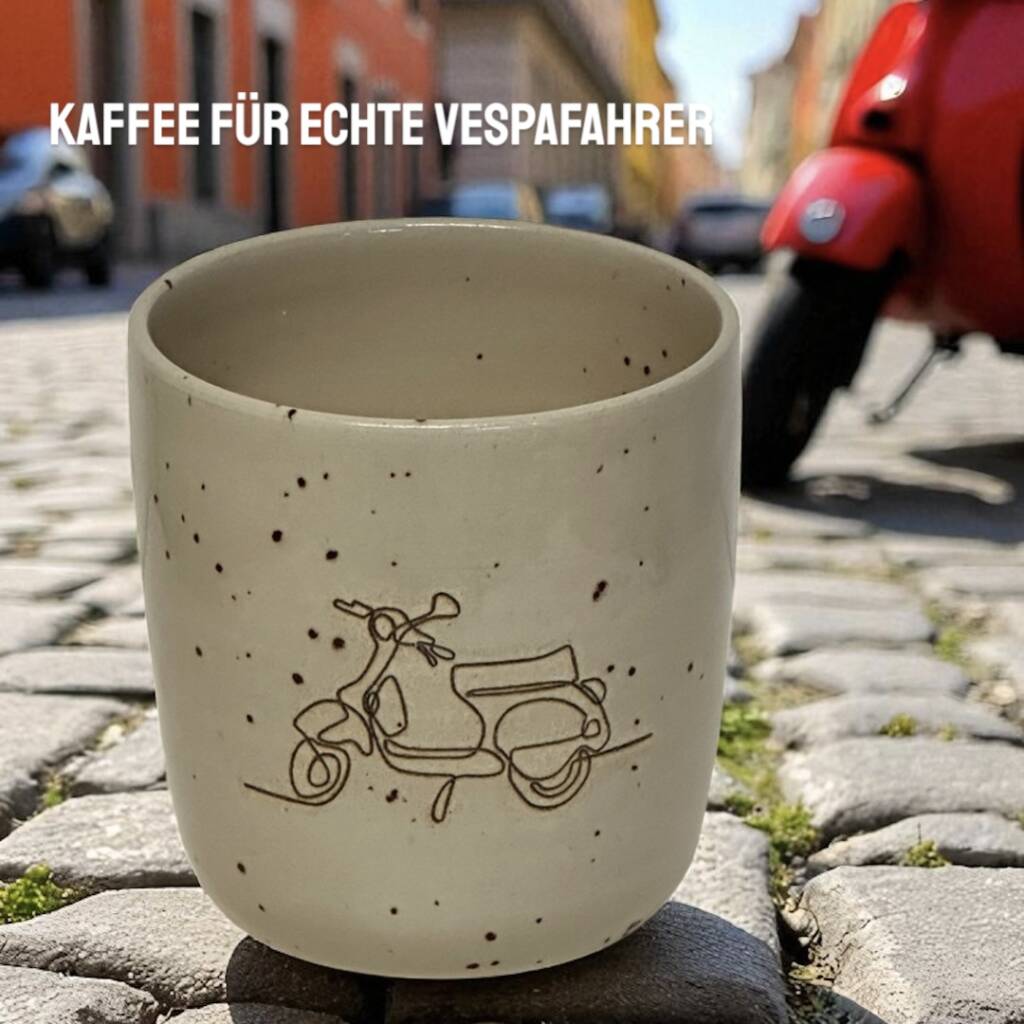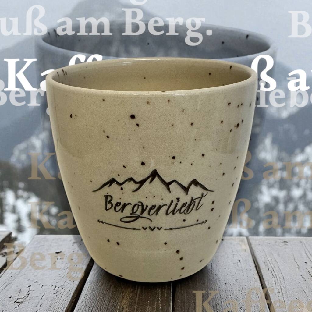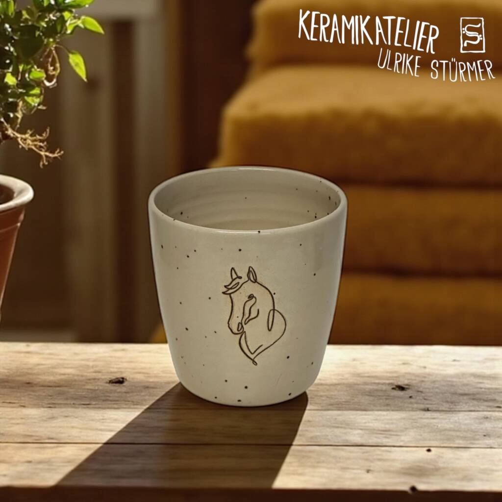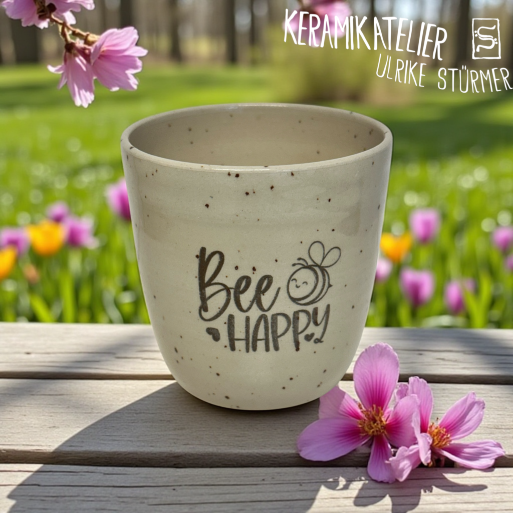 Diese Keramikbecher werden auf der Töpferscheibe handgedreht, geschrüht und anschließend nach dem Schrühbrand mit moderner Lasertechnik graviert. Danach werden sie glasiert und bei 1230 °C gebrannt. So entstehen langlebige, spülmaschinenfeste Unikate mit dauerhaft eingebranntem Motiv.
