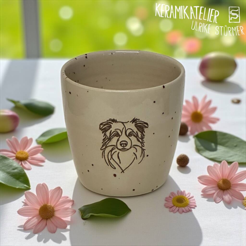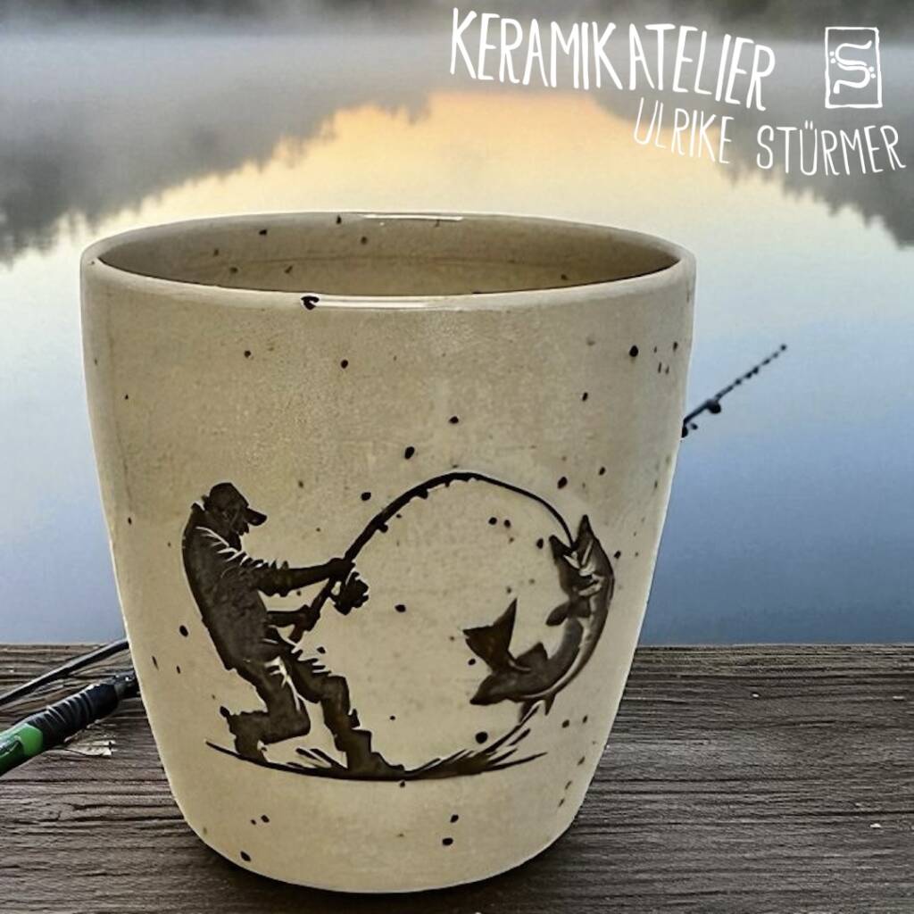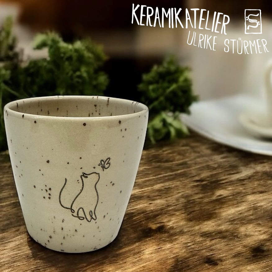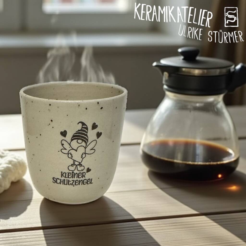 Diese Keramikbecher werden auf der Töpferscheibe handgedreht, geschrüht und anschließend nach dem Schrühbrand mit moderner Lasertechnik graviert. Danach werden sie glasiert und bei 1230 °C gebrannt. So entstehen langlebige, spülmaschinenfeste Unikate mit dauerhaft eingebranntem Motiv.