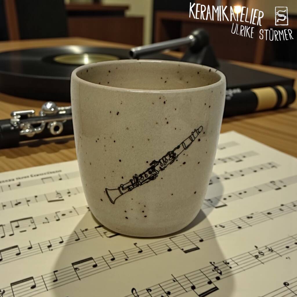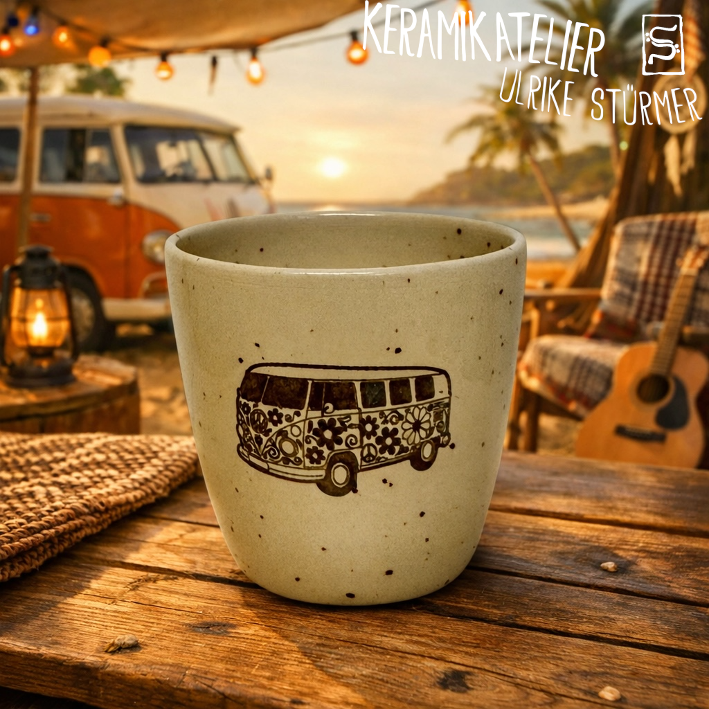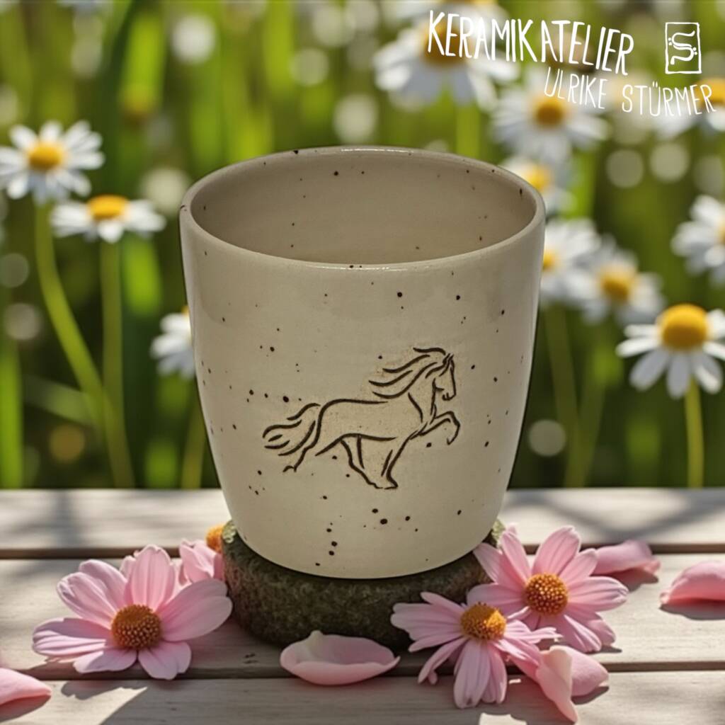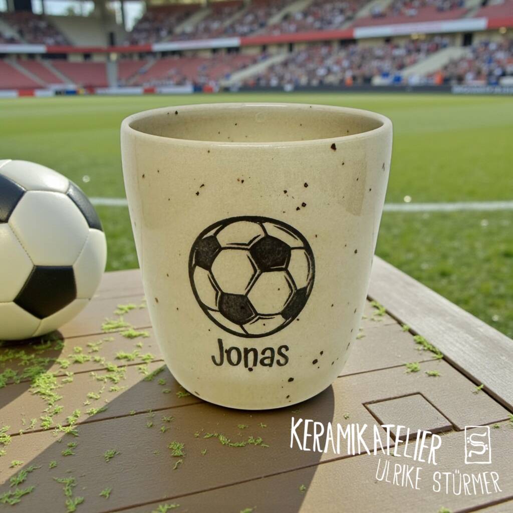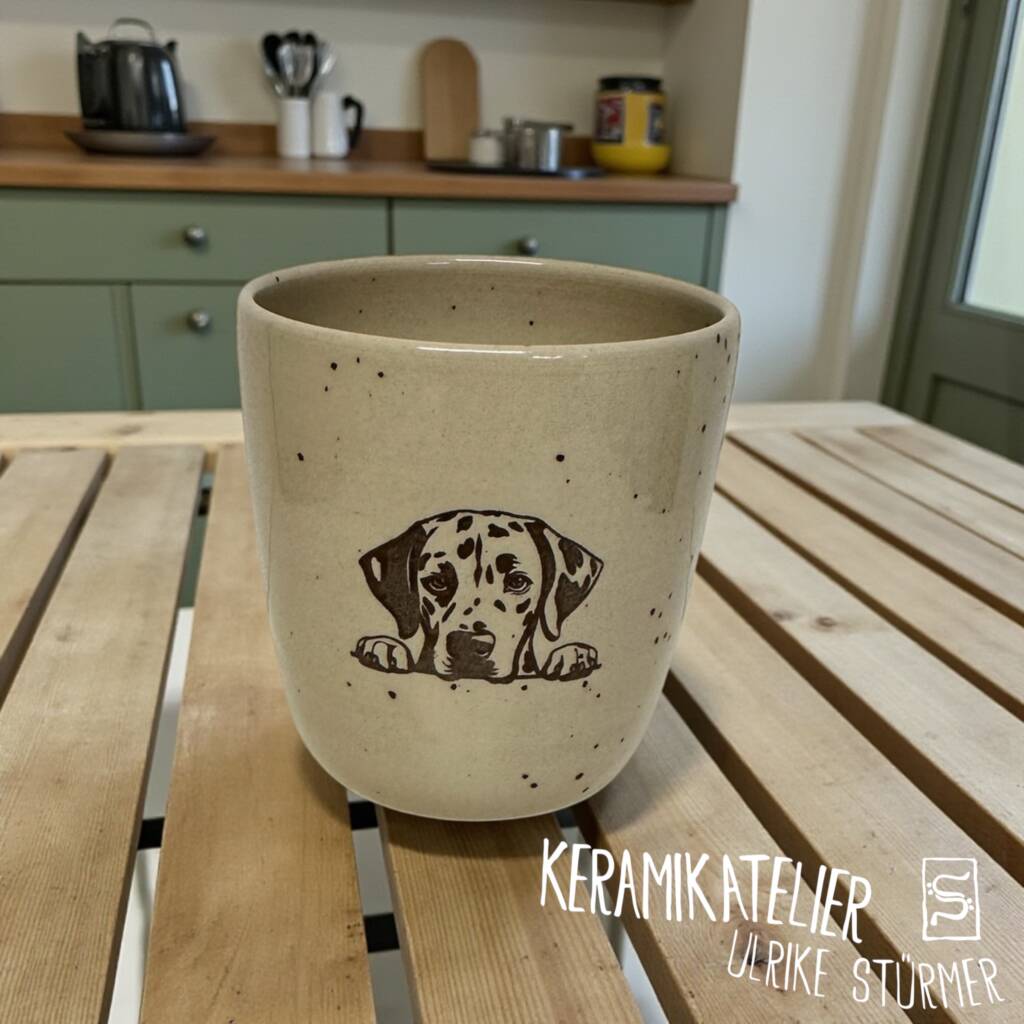 Diese Keramikbecher werden auf der Töpferscheibe handgedreht, geschrüht und anschließend nach dem Schrühbrand mit moderner Lasertechnik graviert. Danach werden sie glasiert und bei 1230 °C gebrannt. So entstehen langlebige, spülmaschinenfeste Unikate mit dauerhaft eingebranntem Motiv.